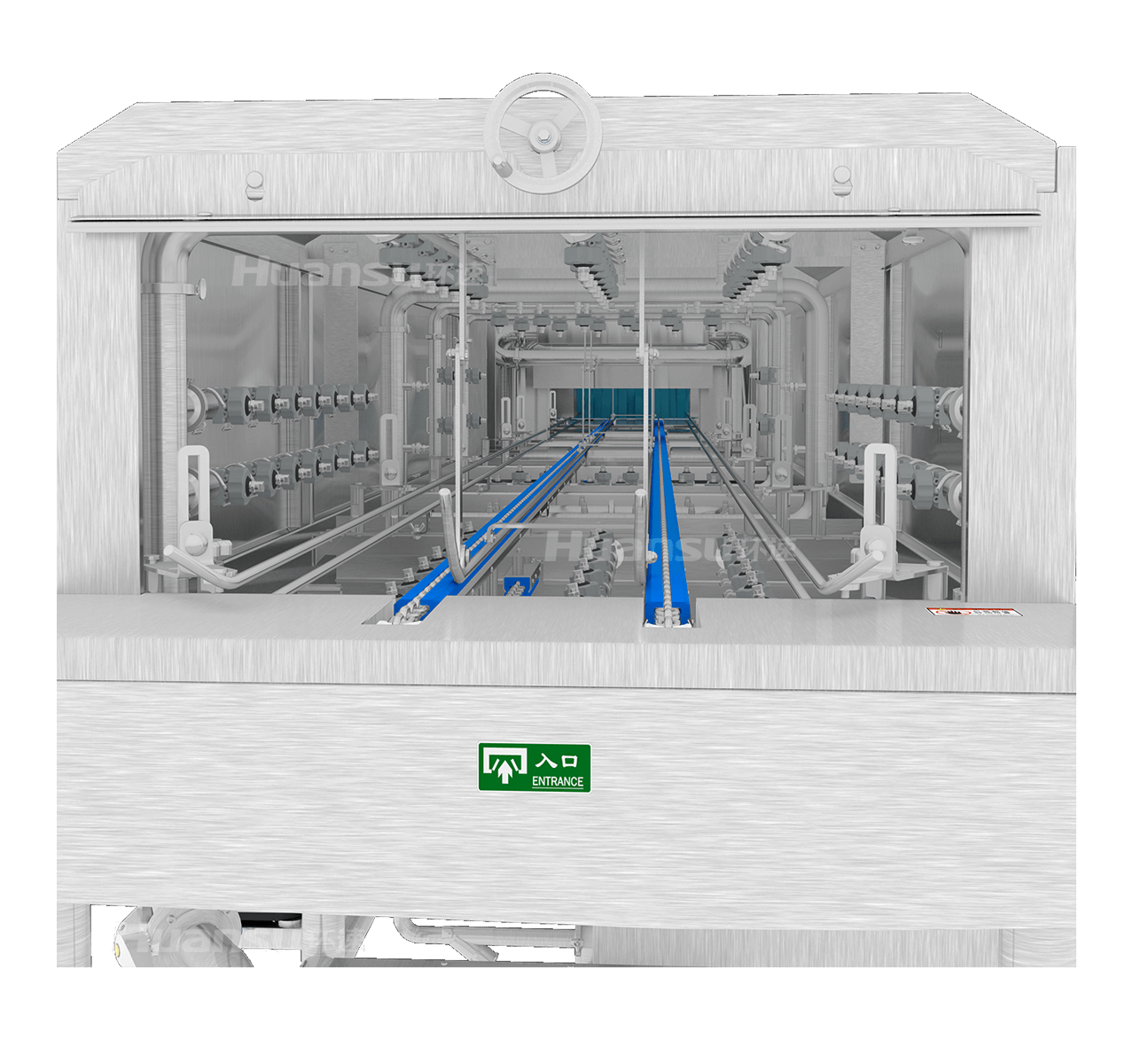 容器在隧道內(nèi)隨導(dǎo)軌行進,先后經(jīng)歷預(yù)洗、主洗、漂洗、凈洗四個步驟。預(yù)洗為高溫、高壓、大流量清洗,用于滅菌和軟化頑固附著物;主洗為高溫、高壓、無死角清洗,用于深度滅菌和強力去污;漂洗為高溫、高壓、噴淋式清洗,用于漂去浮沫與污水;凈洗為常溫、高壓、噴淋式清洗,用于凈水清洗以及為容器降溫。