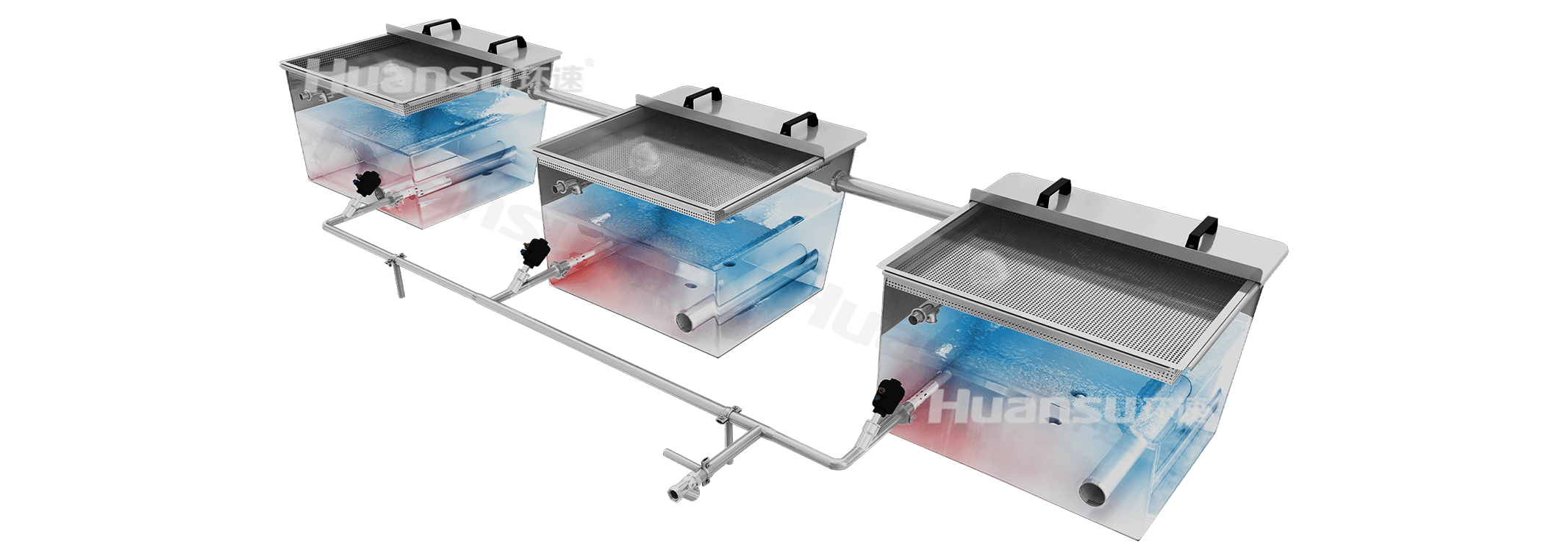 供水系統(tǒng)由三個水箱串聯(lián)而成。各級水箱分別為不同的清洗步驟供水;使用后的水不會直接排放,而是重新回流到水箱中,先后經(jīng)過兩道過濾后重復(fù)利用。水箱之間由管路連通。管路存在高度差,可確保外接自來水沿梯度流動,逐級為水箱補充水量,并起到稀釋、凈化水質(zhì)的作用。處于最低位的水箱實時排出水面漂浮的油污等雜質(zhì),持久保證用水衛(wèi)生。