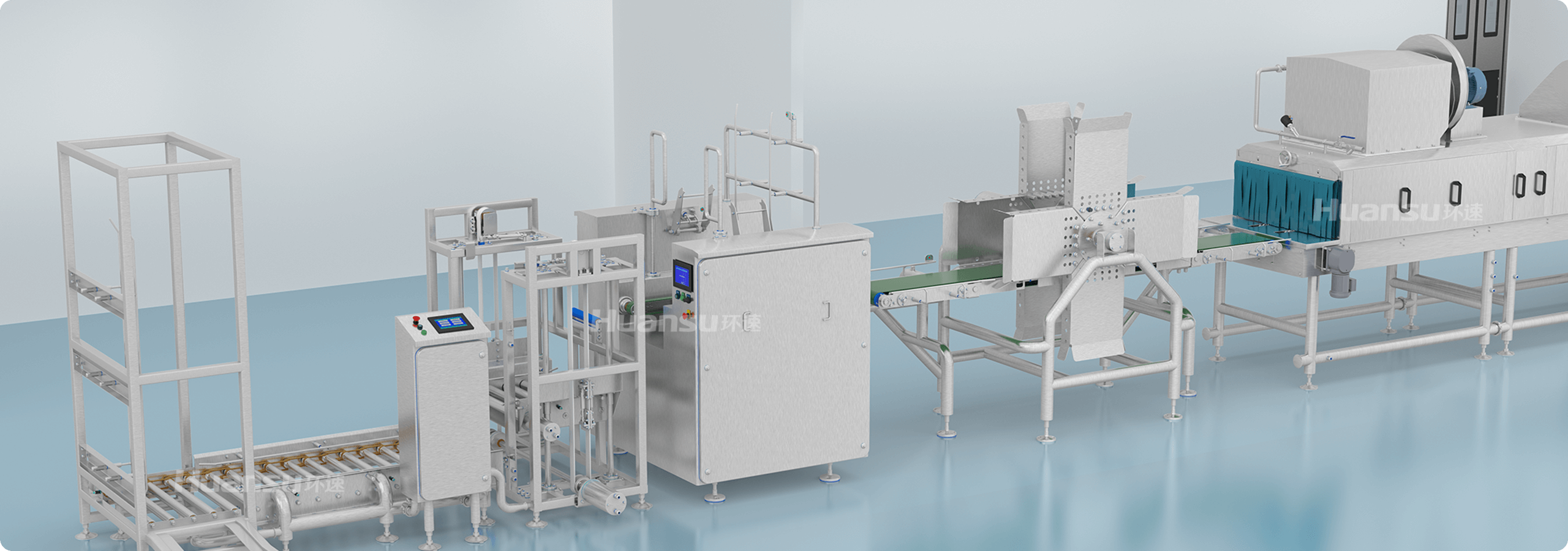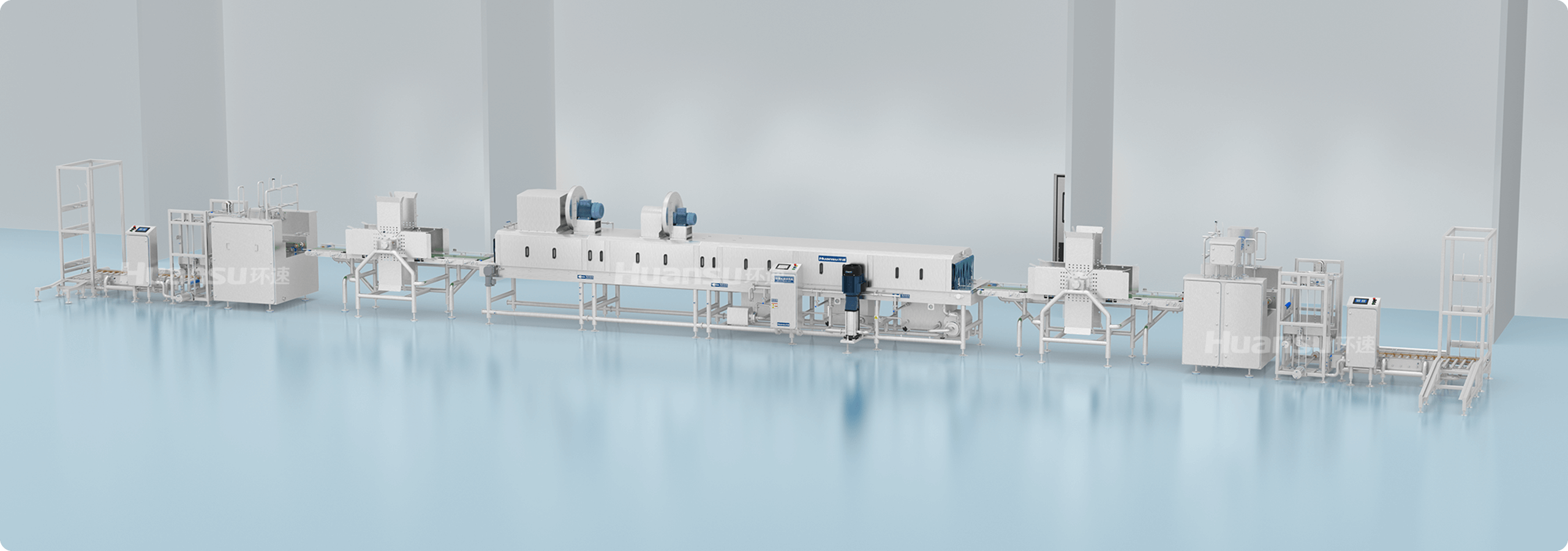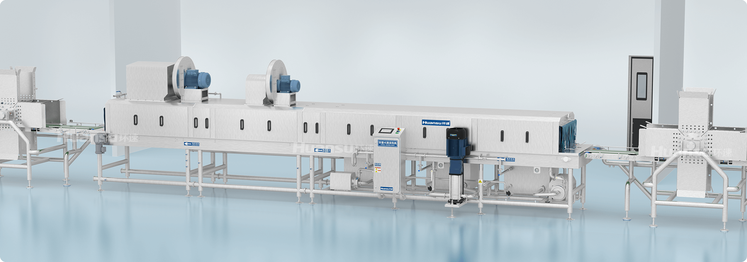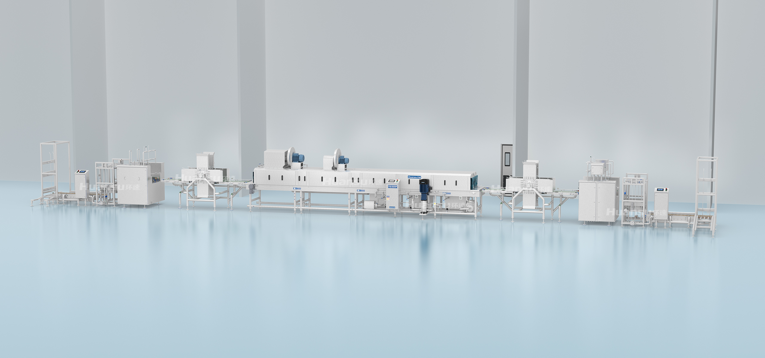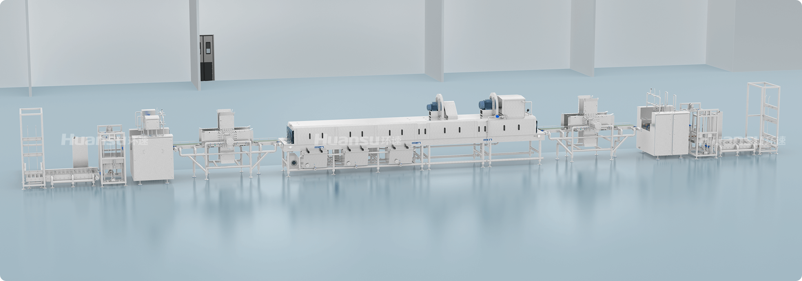 全線設(shè)備高防護(hù)、易清洗,可直接進(jìn)行高壓水洗、化學(xué)清洗、蒸汽滅菌等。無(wú)縫焊接、管內(nèi)走線等工藝,保障生產(chǎn)線的易清潔性。隧道側(cè)擋板、管路、噴頭、鏈條、風(fēng)刀等部件采用易拆設(shè)計(jì),清洗無(wú)障礙;隧道進(jìn)出口設(shè)有擋水簾,保持車(chē)間衛(wèi)生。