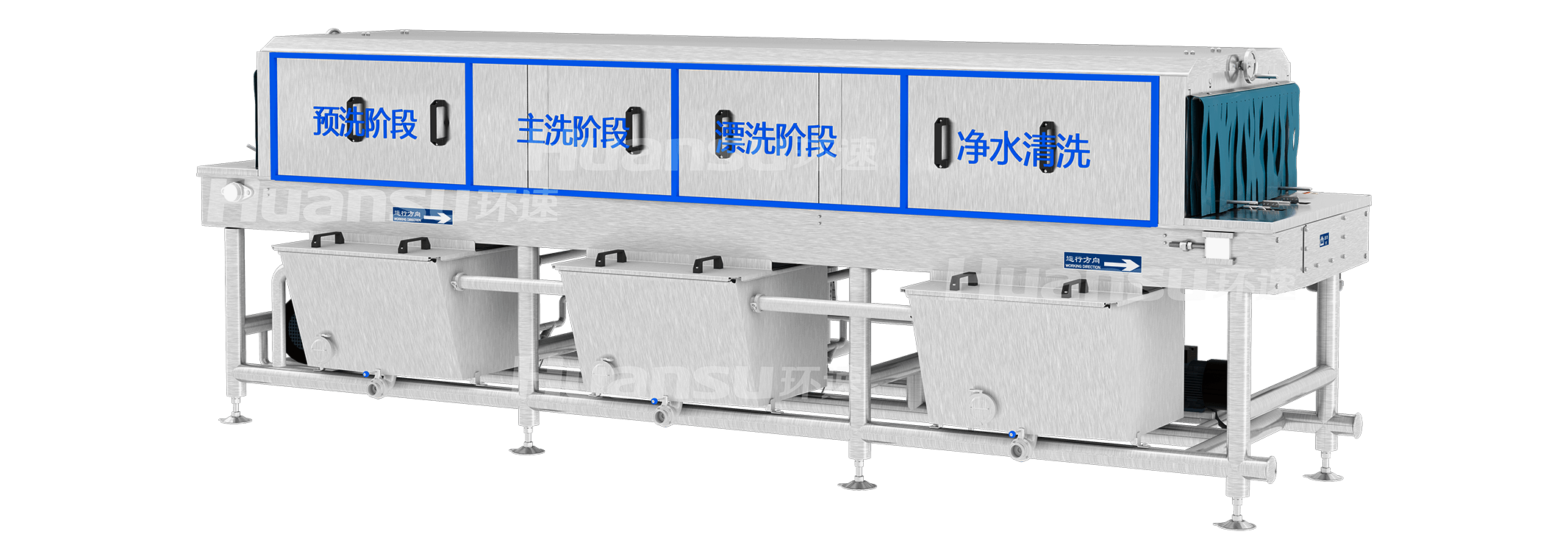 清洗流程依次為預(yù)洗、主洗、漂洗、凈洗。預(yù)洗為高溫高壓大流量清洗,水流量大,用于高溫滅菌和軟化頑固附著物;主洗為高溫高壓無死角清洗,水壓值高,用于深度滅菌和強力去污;漂洗為高溫高壓噴淋,水質(zhì)較為潔凈,用于漂去浮沫與殘留的污水;凈洗為常溫高壓噴淋,由外接管路直接供水,用于凈水清洗,并對周轉(zhuǎn)箱進行降溫。