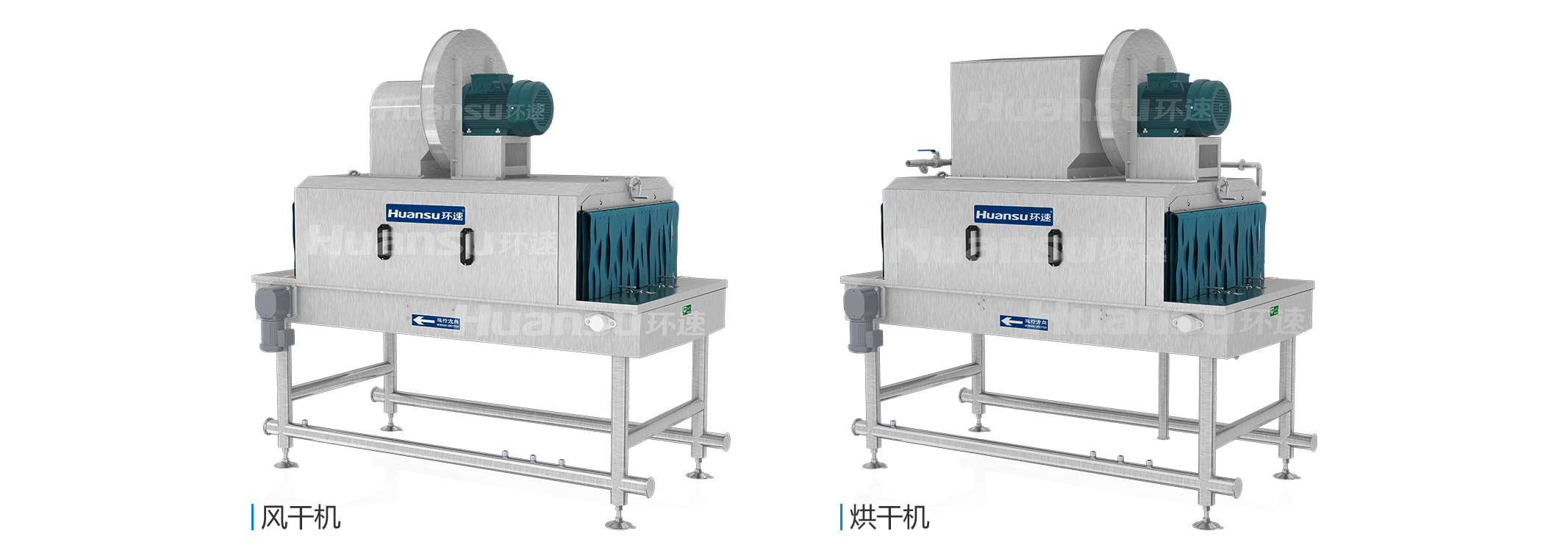 清洗隧道末端可連接風干機和烘干機,用來對周轉(zhuǎn)箱進行快速除水。用戶可根據(jù)對除水率的實際要求,靈活搭配風干、烘干及風烘組合。風干機應(yīng)用了本公司自主研發(fā)的風刀裝置,可將風機產(chǎn)生的壓縮空氣轉(zhuǎn)化為薄片狀的高壓風刀,快速剝離容器表面的水分。烘干機是在風干機基礎(chǔ)上增設(shè)有加熱裝置,產(chǎn)生的是高溫刀風,剝離水分的同時還能利用熱量促進殘余水分蒸發(fā),進一步提高除水率。