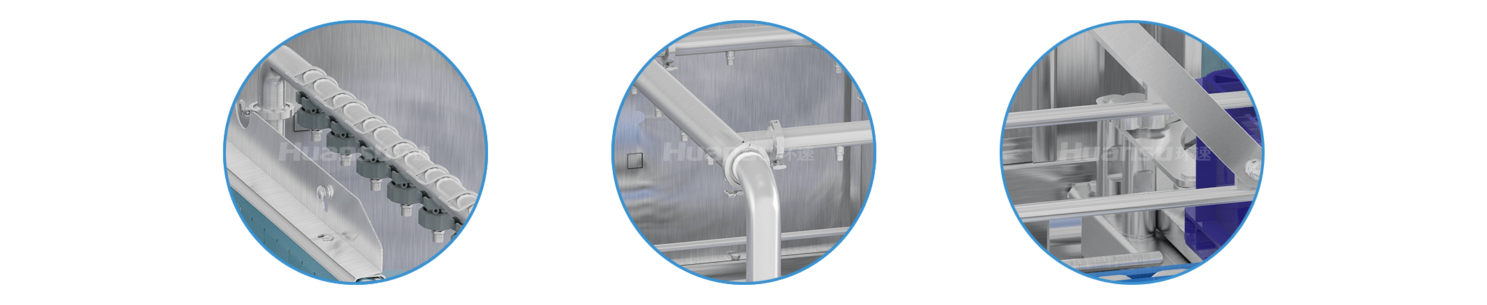 設(shè)備注重自身的衛(wèi)生度,采用衛(wèi)生級的零配件、橡膠密封圈等設(shè)計,確保接固處過渡平滑無縫隙,避免藏污納垢。傳送鏈條配備專用清洗噴頭,可避免筐盤與設(shè)備交叉污染。水箱設(shè)置有兩層過濾網(wǎng),可保證循環(huán)用水的潔凈度。