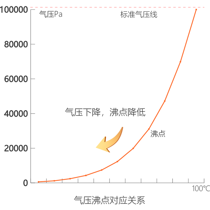 氣壓越低水的沸點越低、水沸騰吸熱,二者結(jié)合起來便是真空冷卻。通過降低食品所處空間的氣壓,將水的沸點從100℃(一個標(biāo)準(zhǔn)大氣壓)降至0℃(610pa),該過程中食品中的水會沸騰吸熱,突破食品自身物質(zhì)構(gòu)造對散熱的影響,最終用微量的水分散失換來食品快速均勻的冷卻。