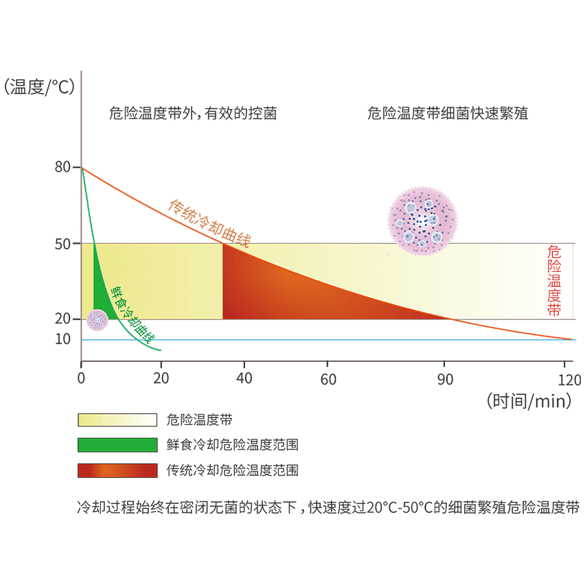 縱觀食品從原料到成品的整個流程,冷卻階段是食品遭受微生物污染的重災(zāi)期,而真空冷卻在防控微生物方面的優(yōu)異性能,可在源頭上改善食品安全。其一,冷卻發(fā)生在全封閉的真空中,無視外部污染威脅,可以保持食品的純粹;其二,冷卻速度極快,可顯著縮短食品在適宜微生物增殖的溫度段內(nèi)的停留時間,相較于傳統(tǒng)方式大幅降低微生物的含量,使食品獲得更長的賞味期。