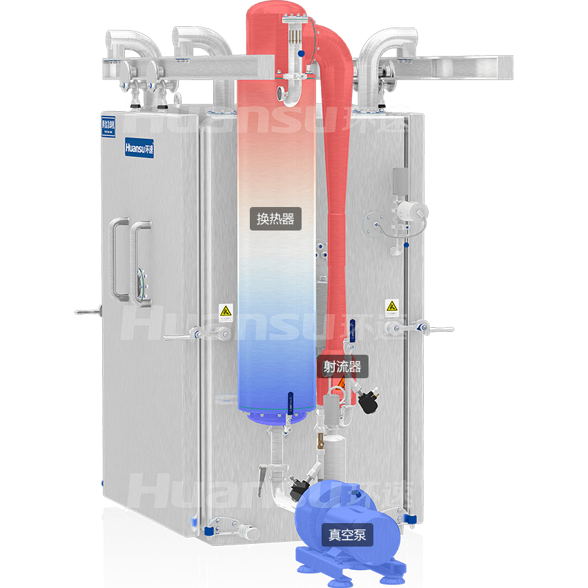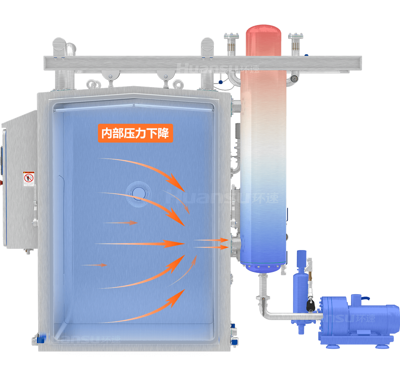 將高溫食品置于人為制造的真空無(wú)菌環(huán)境中,由于食品的實(shí)際溫度高于該氣壓下水的沸點(diǎn),故而食品中的水將自發(fā)沸騰吸熱,使食品內(nèi)外同步冷卻,無(wú)需借助其它制冷手段。