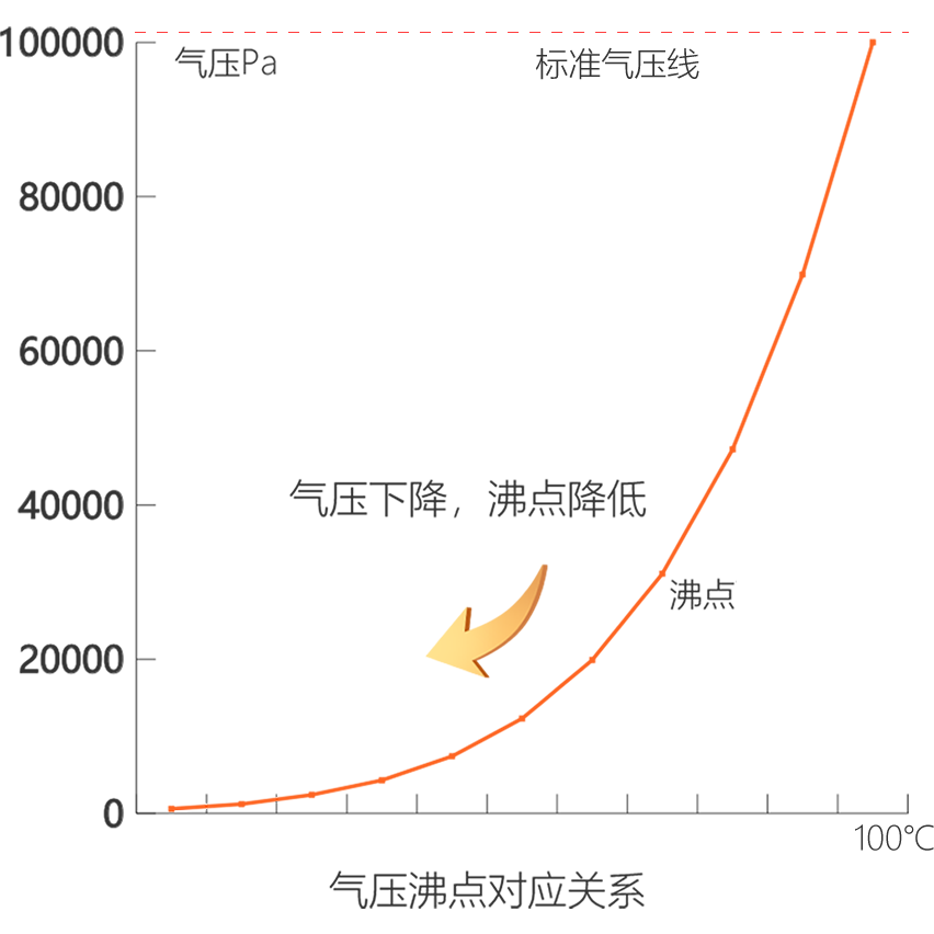 氣壓越低,水的沸點(diǎn)越低;水的沸騰溫度(沸點(diǎn))越低,吸熱能力越強(qiáng)。從1個(gè)標(biāo)準(zhǔn)大氣壓(101325Pa)降到610Pa時(shí),水的沸點(diǎn)將從100℃降為約0℃,吸熱能力也從2256kJ/kg提高到2500kJ/kg。通過(guò)抽真空來(lái)降低水的沸點(diǎn),只要食品溫度高于該沸點(diǎn)時(shí),其所含水分便將自發(fā)持續(xù)沸騰吸熱,直到食品降至該沸點(diǎn)溫度。