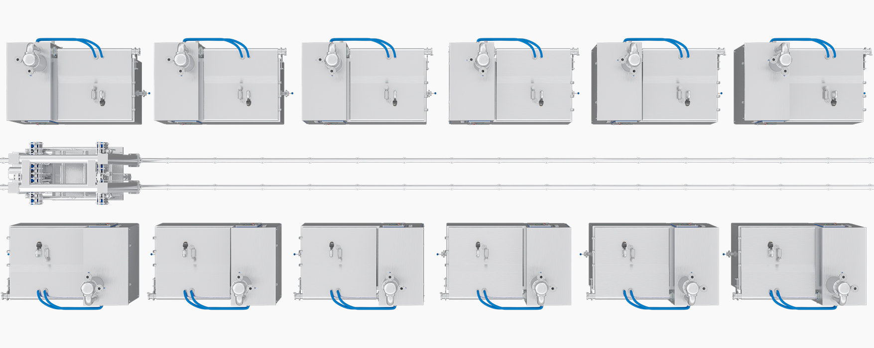 根據(jù)食品種類和車間實(shí)況選擇性配置冷卻機(jī)的款式與排布方案,(單艙室款多設(shè)備橫列式排布/多艙室款上下層疊式排布/頂開(kāi)門款陣列式排布),輔以配套的自動(dòng)輸送帶與智能移送機(jī)運(yùn)載食品,交由智控中樞統(tǒng)一調(diào)度,全流程自主運(yùn)行無(wú)需人工;發(fā)揮真空冷卻速度快、內(nèi)外同冷、密閉無(wú)菌的優(yōu)勢(shì),并根據(jù)食品種類調(diào)試專屬冷卻工藝,實(shí)現(xiàn)智能化、大批量、連續(xù)式的食品冷卻。