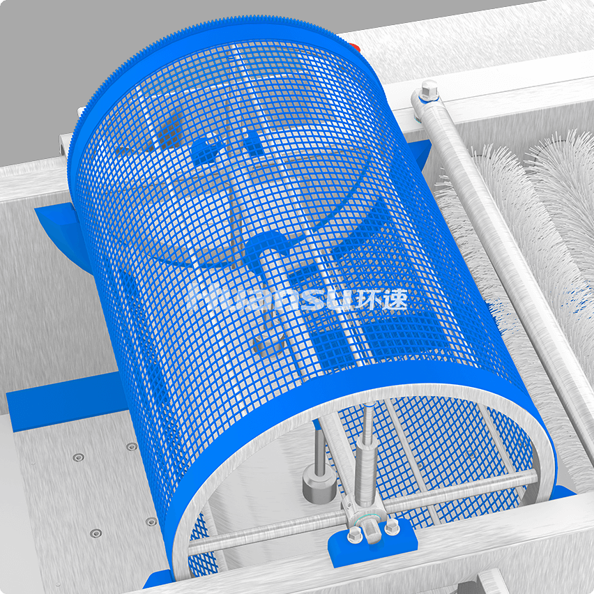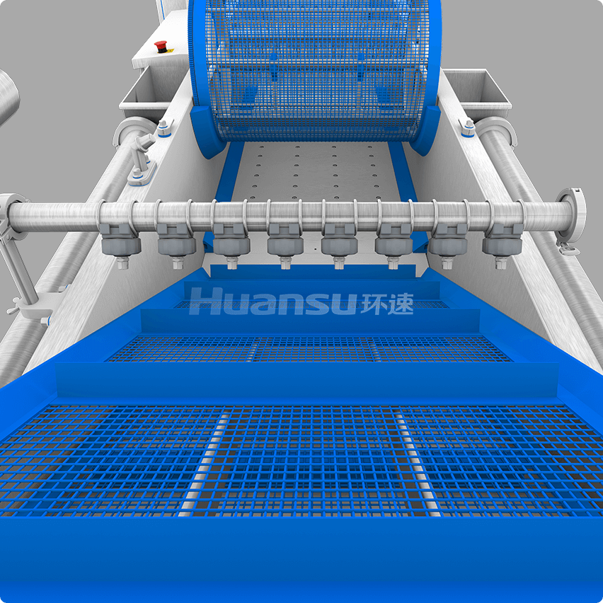 食材隨輸送網(wǎng)帶前往出料口,途中受到凈水噴淋,去除殘留物與清洗液;水流穿過網(wǎng)帶后回收至水箱,經(jīng)過濾網(wǎng)去除水中的懸浮物后重新進(jìn)入水循環(huán);泥沙等沉淀物透過網(wǎng)帶沉入槽底的隔離倉,沿斜面向排污口匯集。