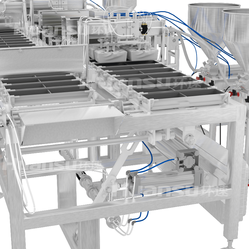 開機后啟動燃燒器,對烤蛋盒預熱;行進系統(tǒng)推動烤蛋盒沿導軌行進,依次完成布油、灌裝、翻轉、壓緊等步驟,使相鄰的兩塊成熟蛋胚合二為一;騰出的空蛋盒繼續(xù)行進,進行新一輪布油、灌裝、翻轉、壓緊等工序;重復四次上述過程,即可得到由五層蛋胚堆疊而成的標準玉子燒。