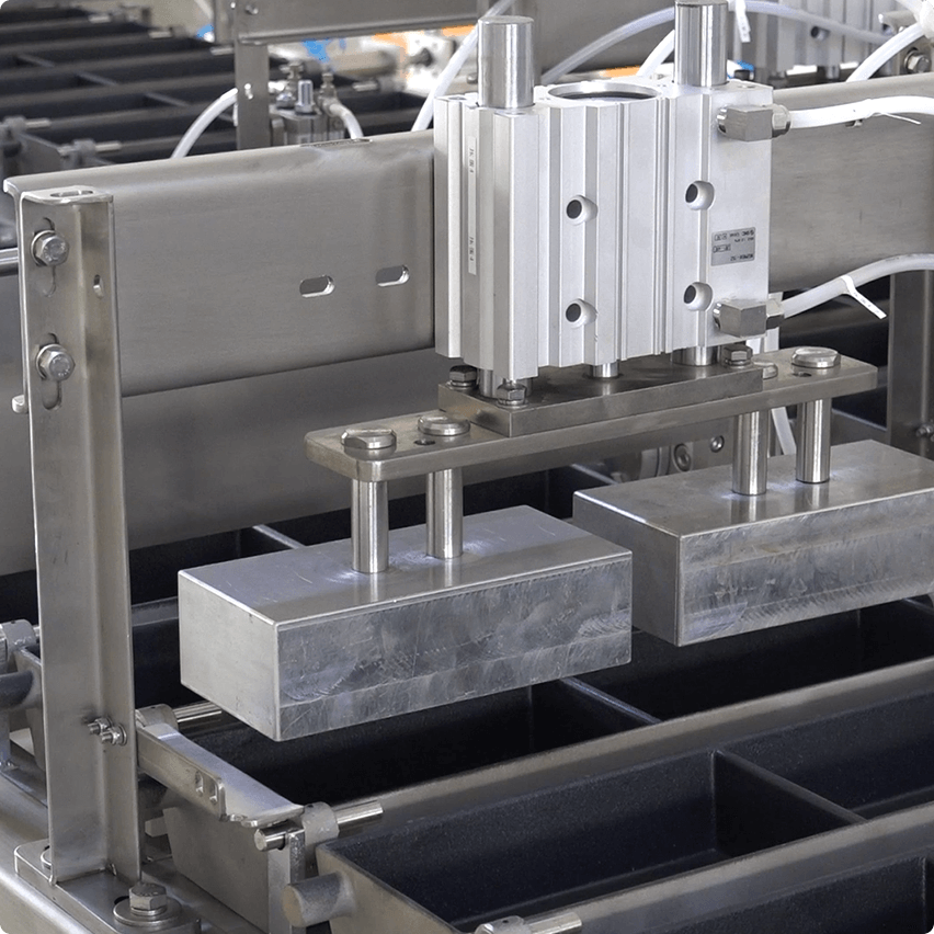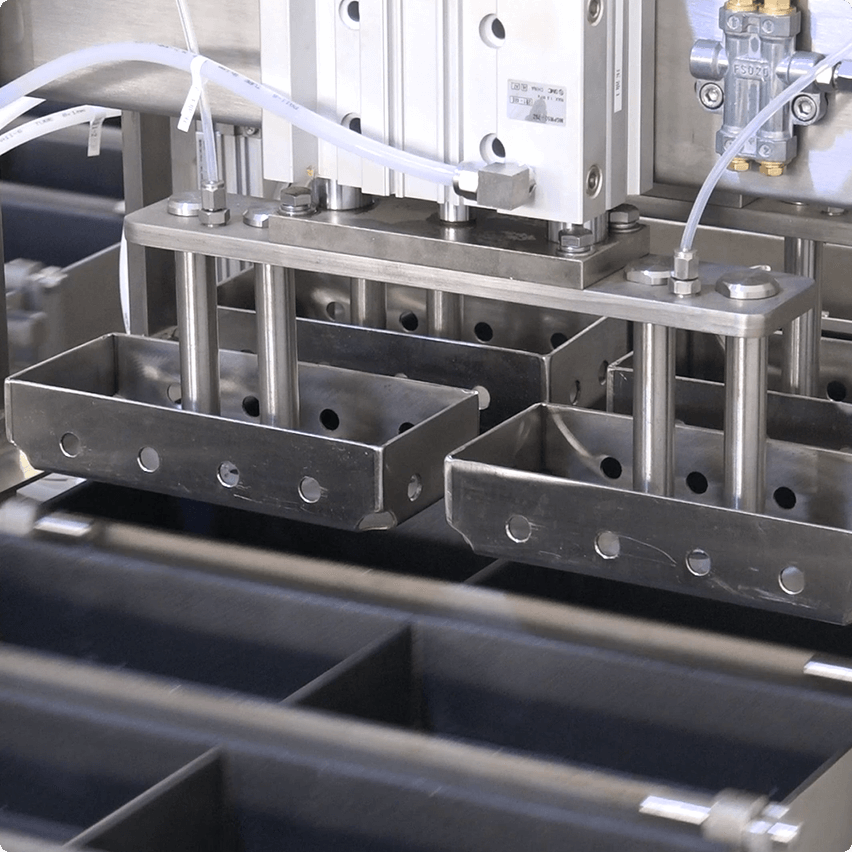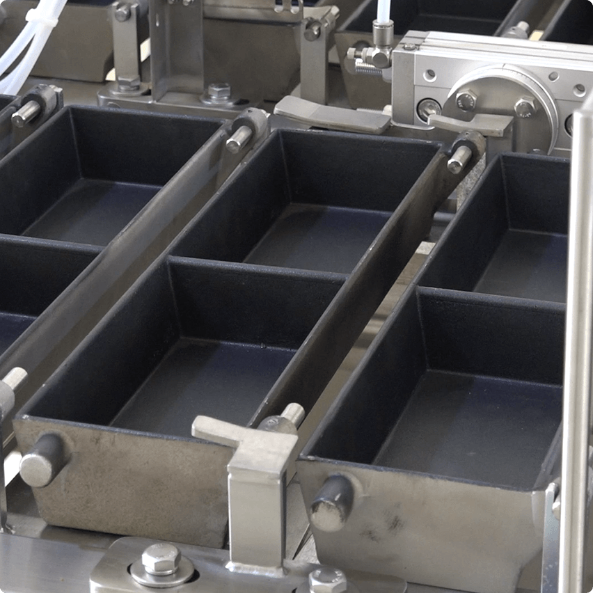 用于盛放蛋液等原料。蛋盒采用雙槽位設計,確保單槽尺寸與標準玉子燒一致;材質為鋁合金,內壁采用特氟龍涂層。蛋盒兩兩一組,可通過翻轉動作完成蛋胚的堆疊。